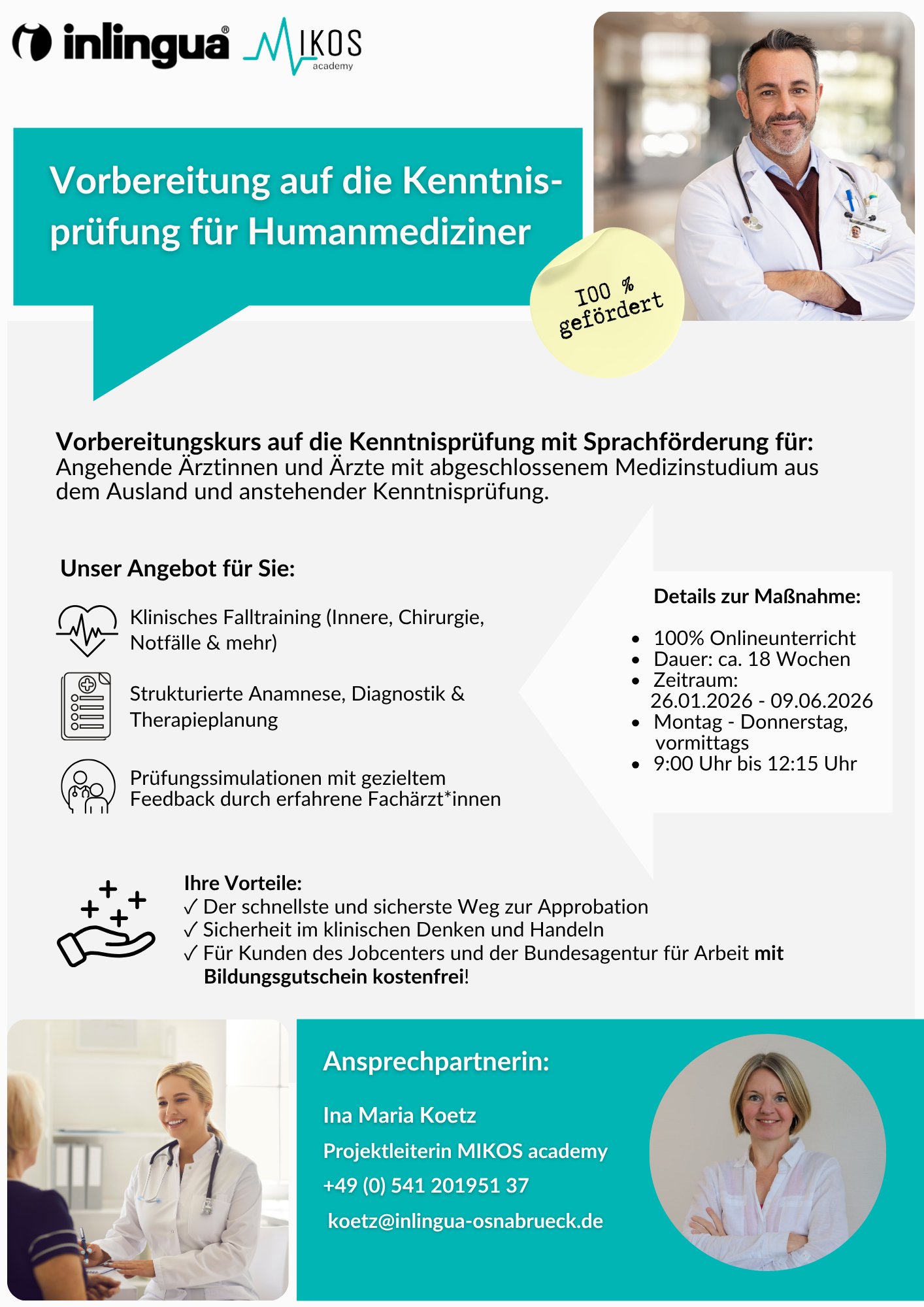 wir freuen uns, Ihnen unseren nächsten Vorbereitungskurs zur Kenntnisprüfung für ausländische Ärztinnen und Ärzte ankündigen zu dürfen.